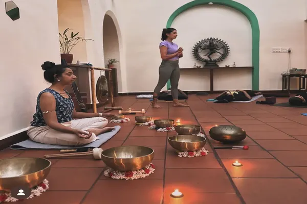 Humming Nest ,RK Hegde Nagar, (Wellness Center), offering meditation and sound bath sessions with Tibetan singing bowls, rain sticks, and therapeutic instruments. Set in a serene Greek-themed space, the 60-90 minute sessions provide deep relaxation and stress relief. Special seating arrangements ensure senior comfort, and herbal teas with light snacks are offered after the session for a complete rejuvenating experience.
